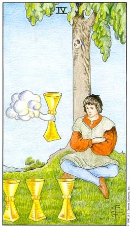 질문 1 : 타로 마이너 윈드 4번 카드, 컵스 4번 카드, 소드 4번 카드, 팬타클 4번 카드에 대해 각 기본 설명과, 사랑과 관련된 해석을 자세히 설명해 줘.