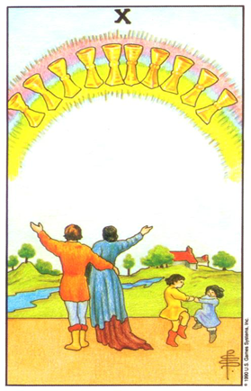 답변 : 각 마이너 아르카나의 10번 카드에 대한 기본 설명과 사랑, 금전, 성공에 대한 해석을 제공하겠습니다.
